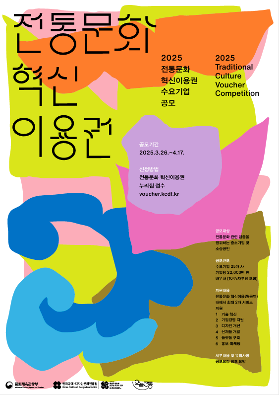 문화체육관광부(장관 유인촌, 이하 문체부)와 한국공예·디자인문화진흥원(원장 장동관 원장, 이하 공진원)은 3월 26일(수)부터 4월 17일(목)까지 전통문화기업의 역량강화를 위한 ‘2025년 전통문화 혁신이용권(바우처) 지원사업’수요기업을 모집한다.