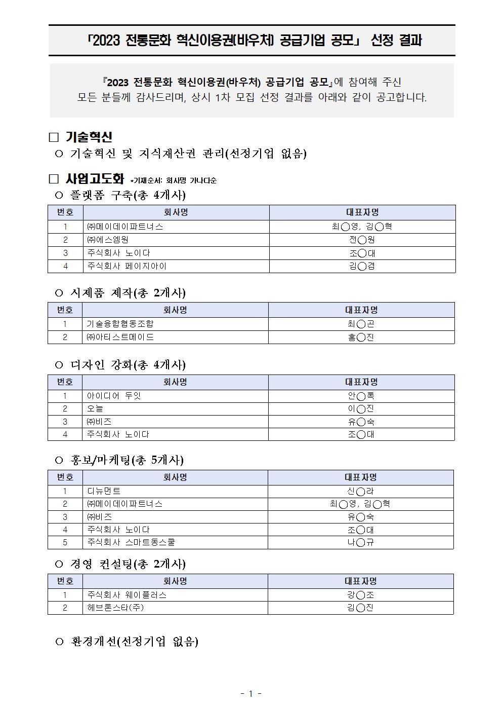 [결과발표] 2023 전통문화 혁신이용권(바우처) 공급기업 공모 (상시 1차) 선정 결과