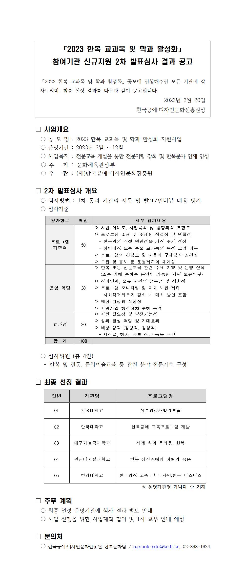 [결과발표] 「2023 한복 교과목 및 학과 활성화」 신규지원 2차 발표심사 결과발표