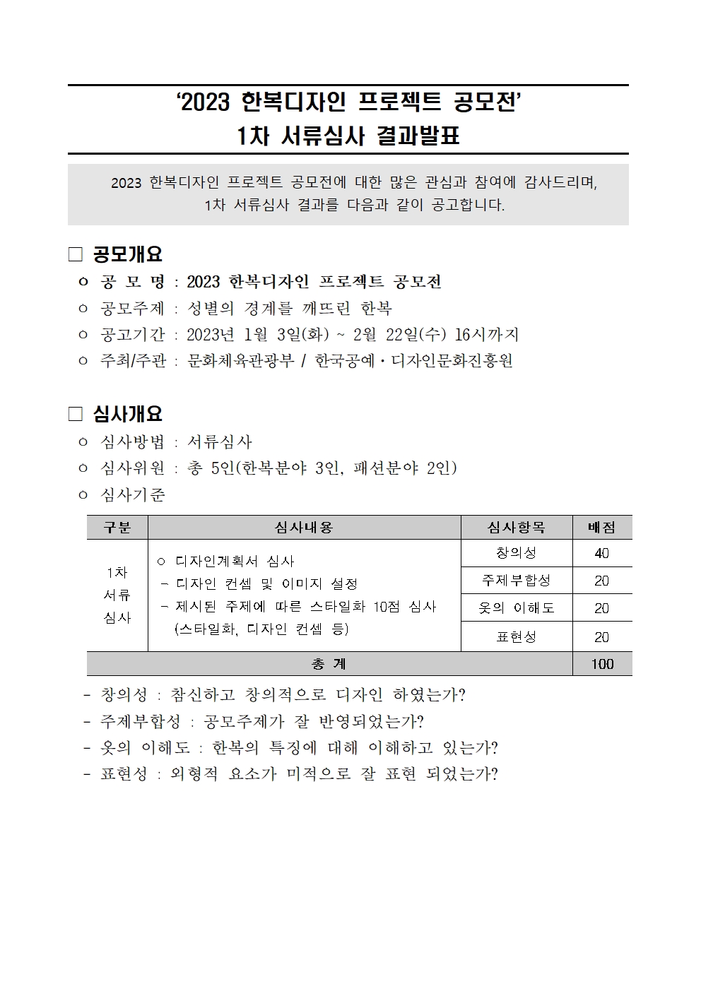 ‘2023 한복디자인 프로젝트 공모전’ 1차 서류심사 결과발표 |