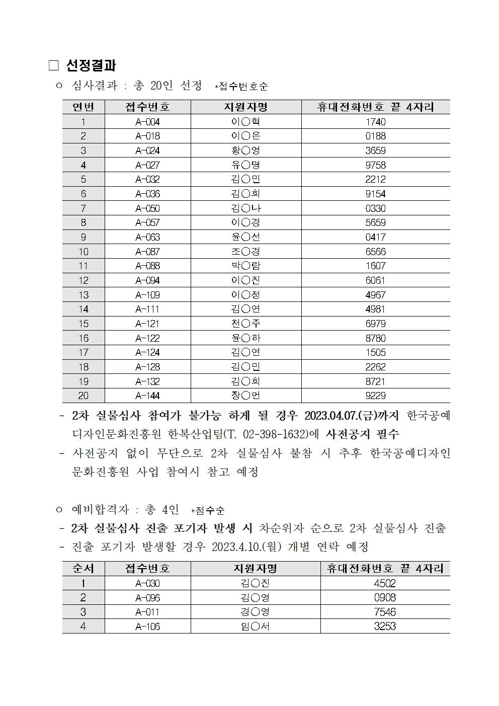 - 2차 실물심사 진출 포기자 발생 시 차순위자 순으로 2차 실물심사 진출