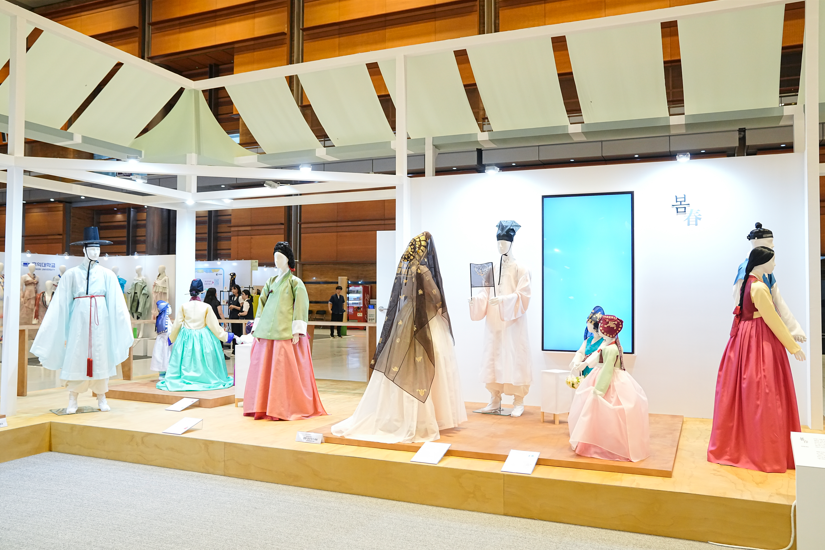 전시 작품은 한국전통문화대학교 ‘전통미술공예학과 전통섬유전공’과 ‘전통섬유복원연구소’가 함께 준비하고, 교수진, 학생, 졸업생들이 참여해 한국의 전통섬유문화를 국내외에 온전히 알리고자 정성을 다했습니다. 전시 작품의 대부분은 학교에서 직접 재현·직조한 옷감을 사용하였으며, 복식 구성은 유물 고증을 바탕으로 손바느질로 제작되었습니다. 단순한 형상 재현을 넘어, 한복이 일상이던 시대의 정신문화와 미적 감수성을 담아내고자 하였으며, 동시에 현대적 미감을 더한 작품을 통해 한복문화의 새로운 가능성도 제안합니다.