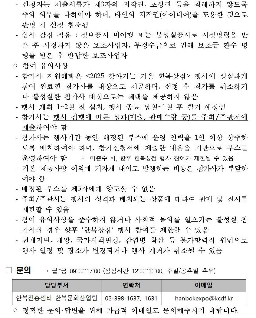 - 참가사 지원혜택은 <2025 찾아가는 가을 한복상점> 행사에 성실하게 참여 완료한 참가사를 대상으로 제공하며, 선정 후 참가를 취소하거나 불성실한 참가사 대상으로는 혜택을 제공하지 않음