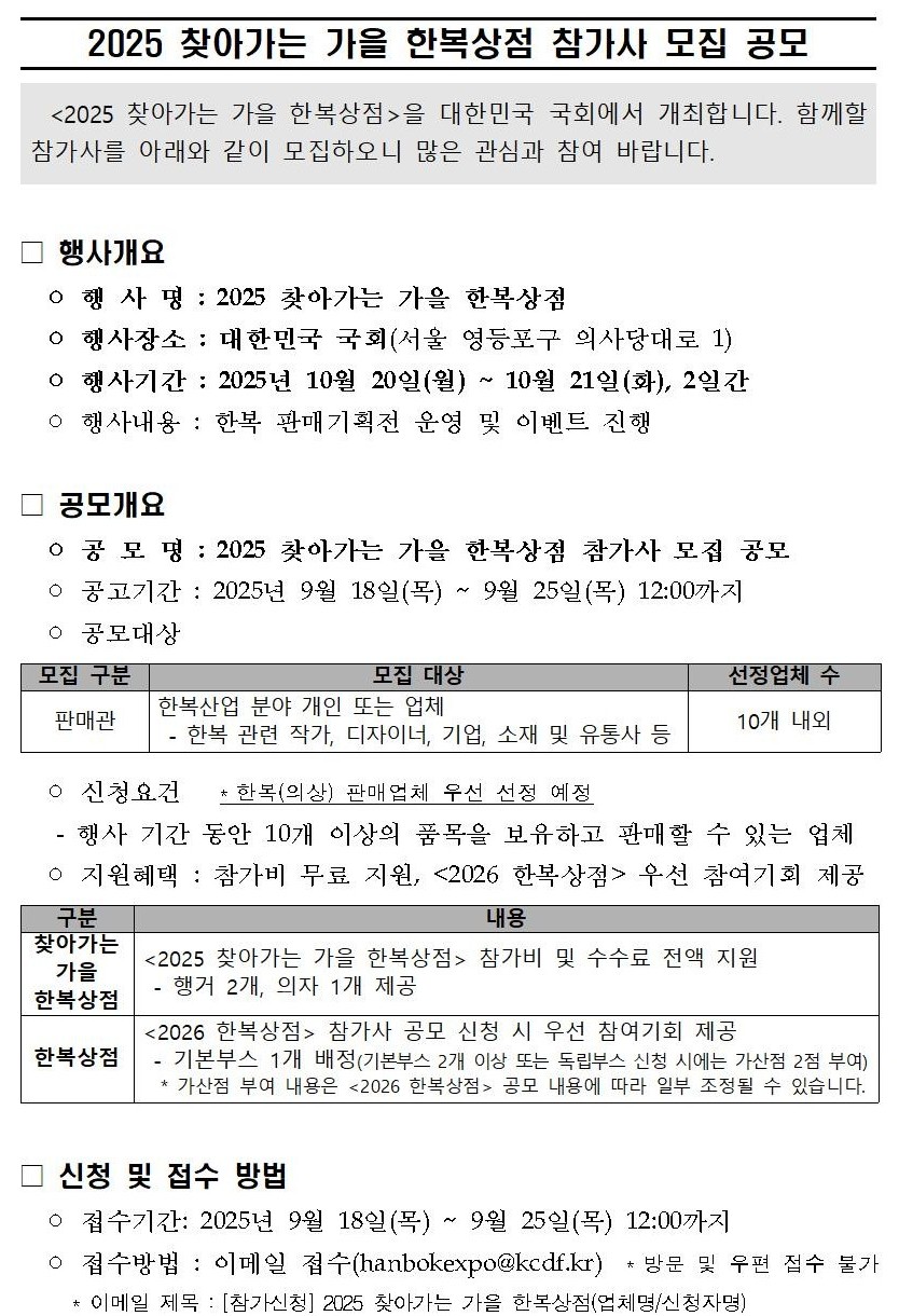 * 이메일 제목 : [참가신청] 2025 찾아가는 가을 한복상점(업체명/신청자명)