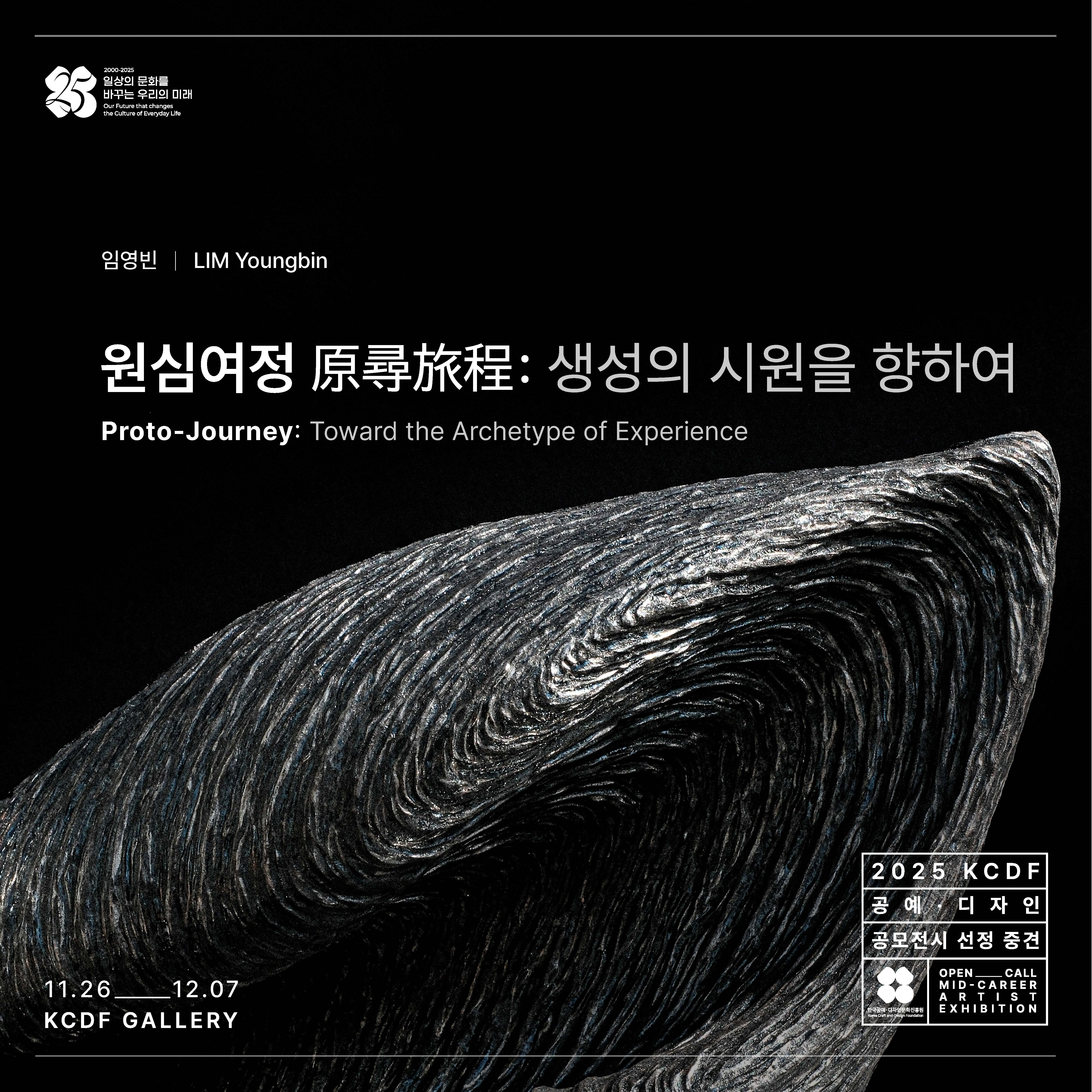 한국공예・디자인문화진흥원(원장 장동광, 이하 공진원)은 중견작가와 신진작가의 창작발표 활동을 지원하는 ‘2025 KCDF 공예・디자인 공모전시 중견부문’에 선정된 도자작가 임영빈(LIM Youngbin)의 개인전 《원심여정 原尋旅程 – 생성의 시원을 향하여_Proto-Journey –Toward the Archetype of Experience》를 오는 11월 26일부터 12월 7일까지 인사동 KCDF갤러리에서 개최한다고 밝혔다.