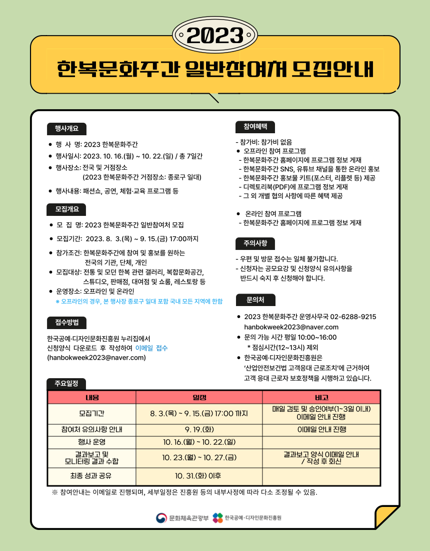 - 전화 02-6288-9215, 02-398-1625 / 이메일 hanbokweek2023@naver.com