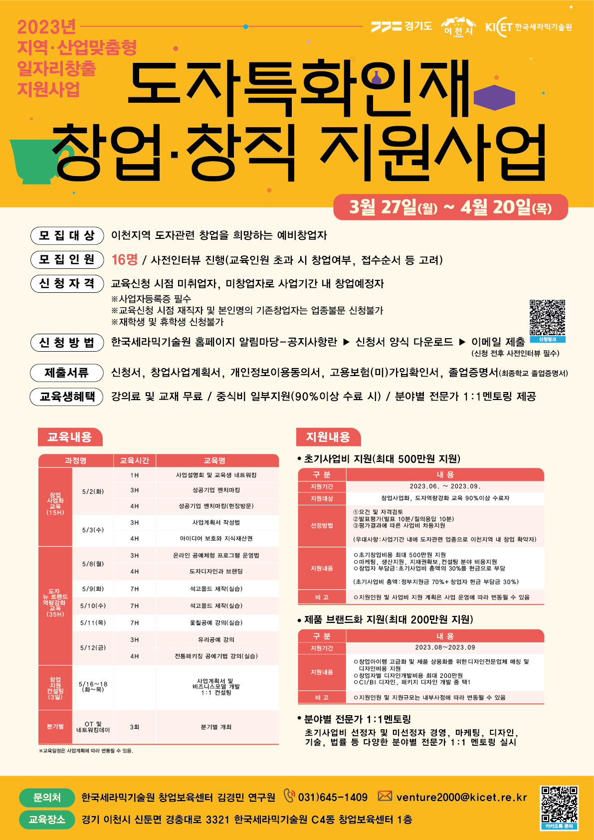 2023년 지역·산업맞춤형 일자리창출 지원사업 「도자특화인재 창업·창직 지원사업」교육생 모집 공고