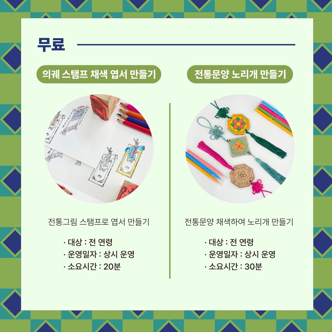 내용: 궁중 행사와 의식을 기록한 의궤에 그려진 전통문양 스탬프로 세상에서 단 하나뿐인 나만의 엽서를 만들 수 있습니다.