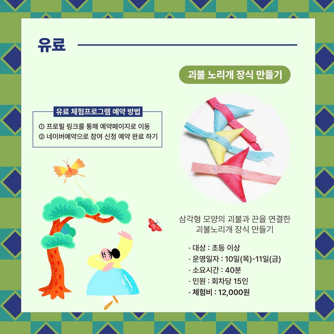 내용: 자투리 천을 모아 솜을 채워만든 삼각형 모양의 노리개로 귀엽고 소담한 괴불노리개를 직접 만들어보는 체험입니다.