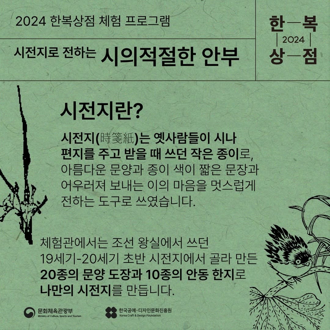 이 체험관에서는 조선 왕실에서 쓰던 19세기-20세기 초반 시전지에서 골라 만든 20종의 문양 도장과 10종의 전통 한지로 나만의 시전지를 만듭니다.