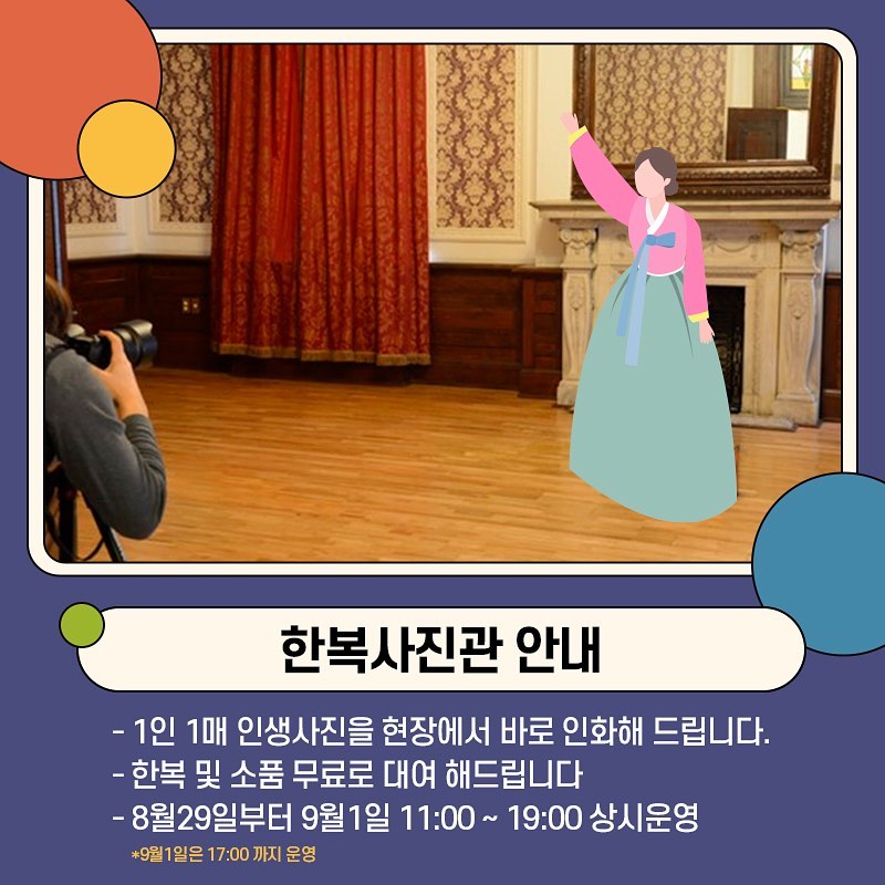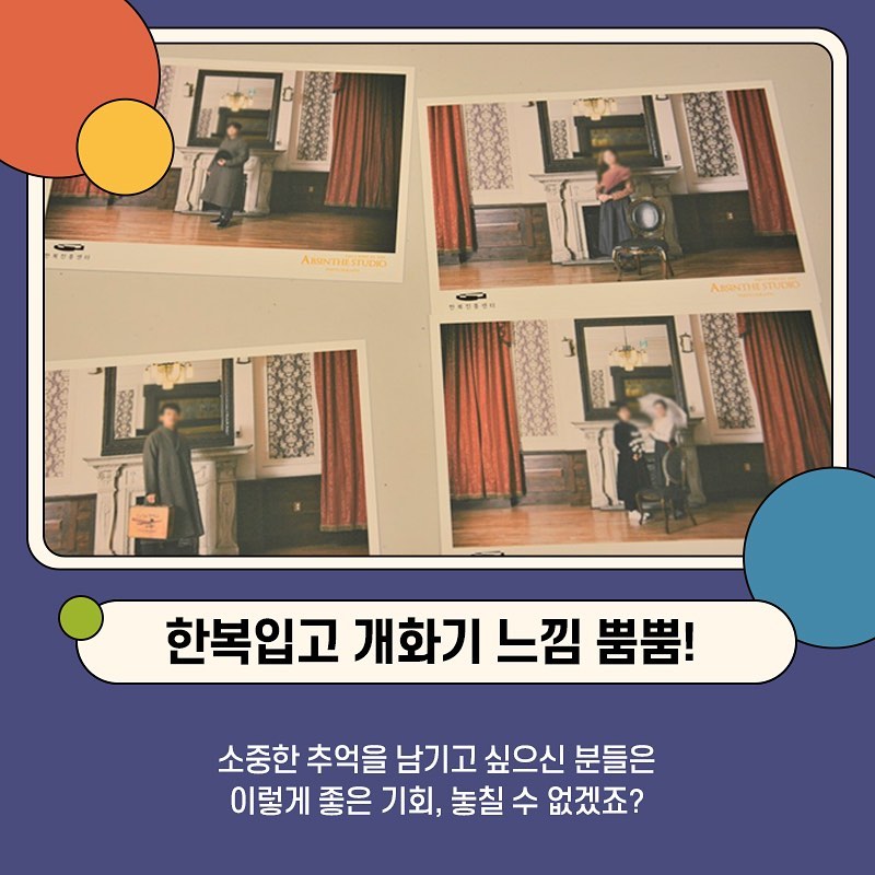 내용: 한복 및 소품을 무료로 대여하여 사진을 남겨보는 체험입니다.