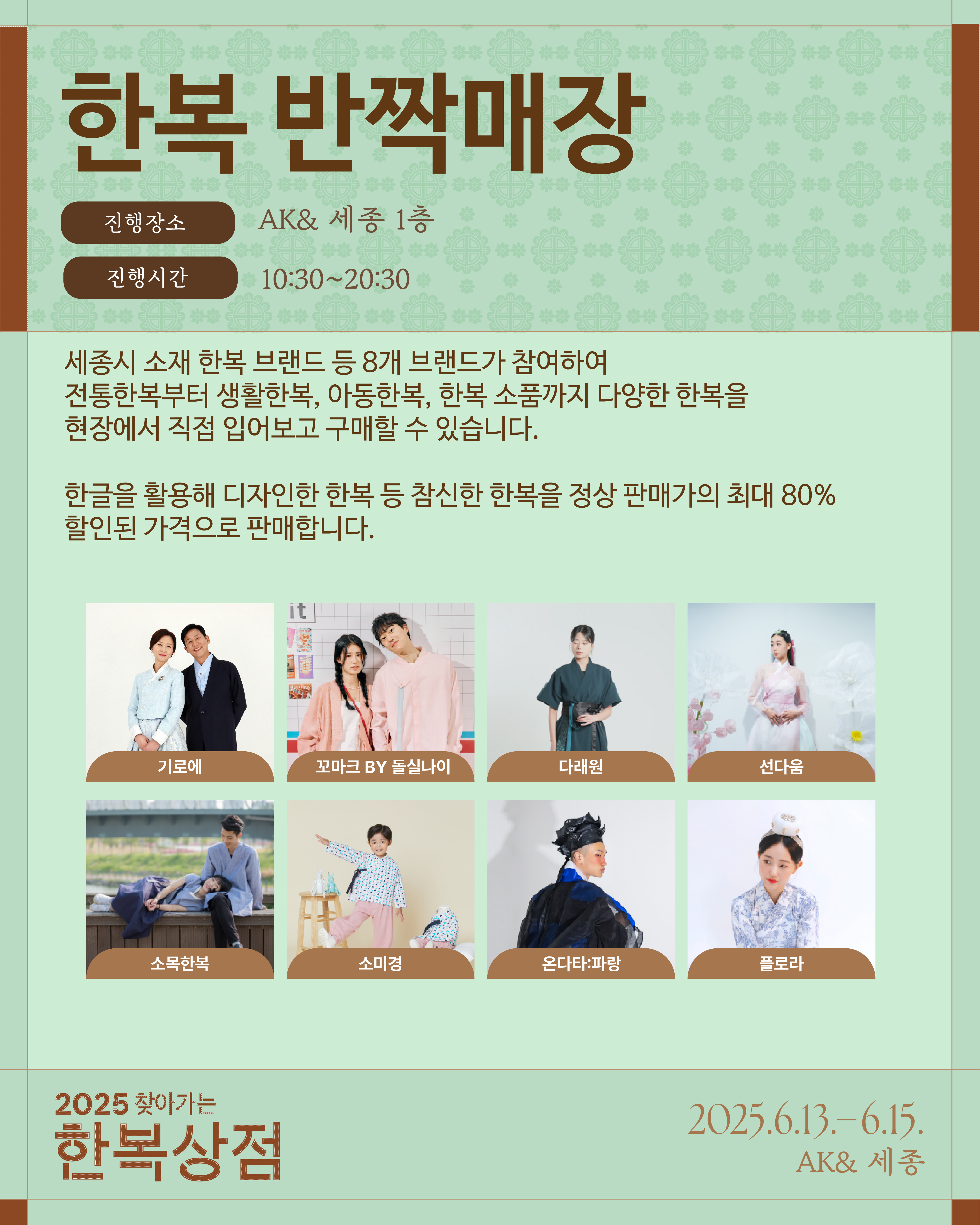- 세종 소재 한복업체 등 총 8개 업체가 함께하는 한복 반짝매장이 운영됩니다.